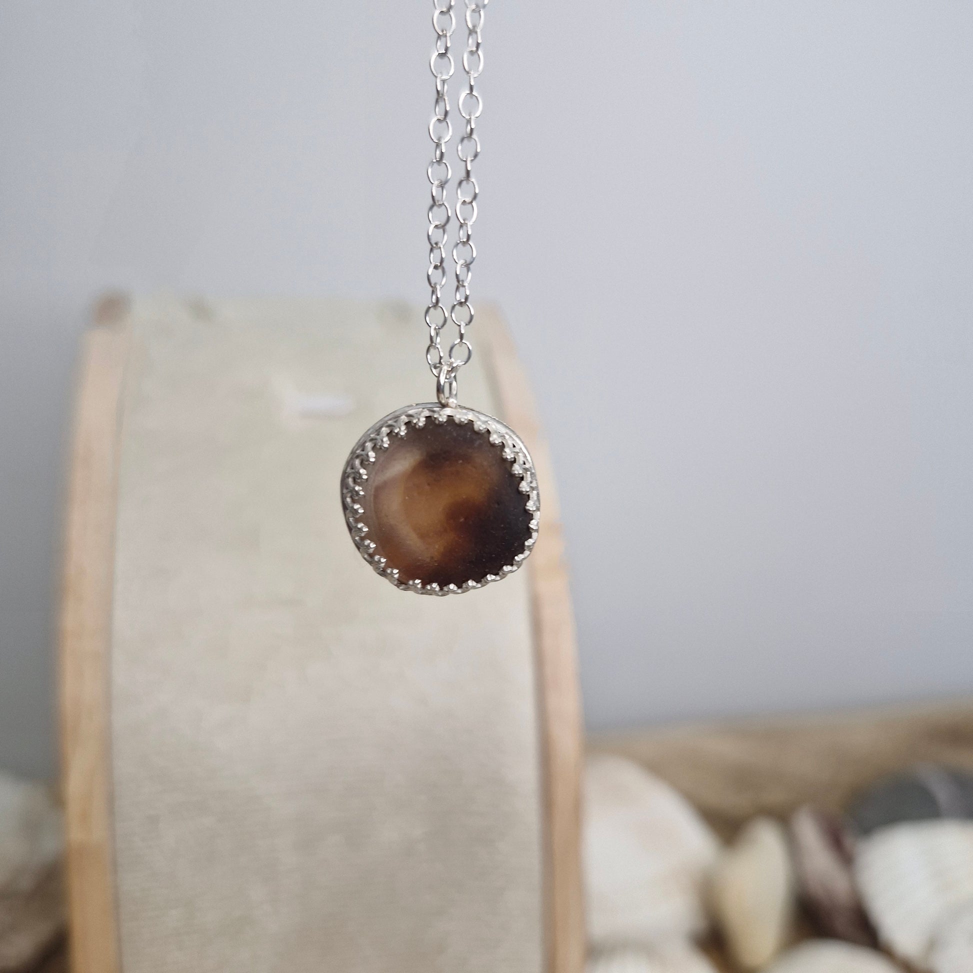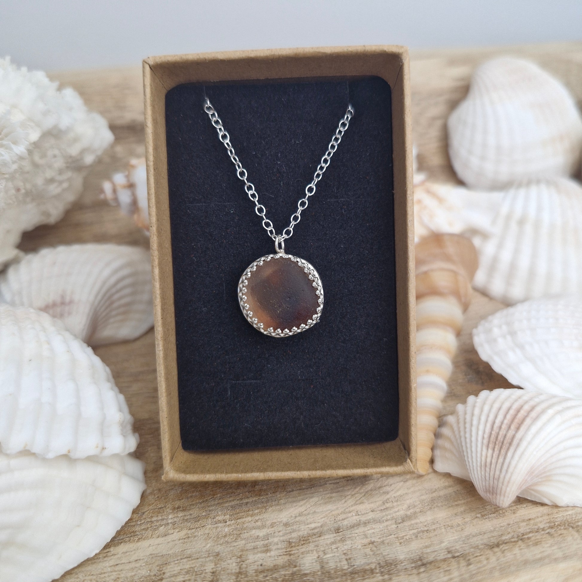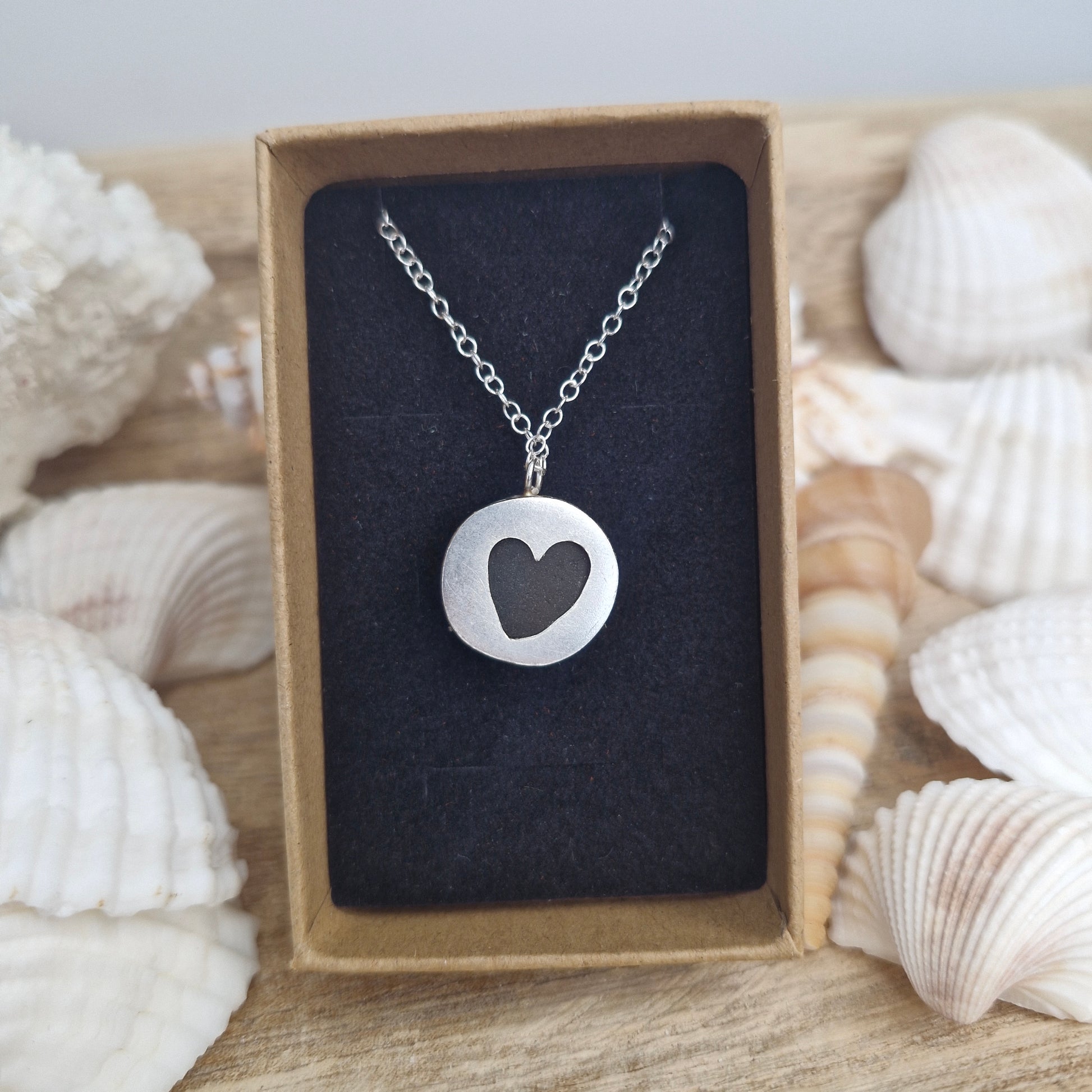 Embrace the beauty of the coast with this one-of-a-kind sea glass necklace, lovingly handcrafted using genuine sea glass and 925 sterling silver. The soft, natural tones of the sea glass are framed in an elegant sterling silver setting with a delicate heart detail on the back — making this piece just as beautiful from behind as it is from the front.
